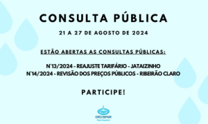 Estão abertas as Consultas Públicas 13 e 14/2024 sobre os pareceres técnicos de reajustes tarifários dos municípios de Jataizinho e Ribeirão Claro.