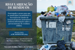 Prazo para os municípios enviarem as informações sobre o gerenciamento de resíduos sólidos foi prorrogado para 31 de agosto. Esses dados são fundamentais para o Estado planejar projetos e direcionar recursos. Não deixe de preencher os questionários de RSU! O descumprimento pode resultar em penalidades como perda de recursos estaduais.